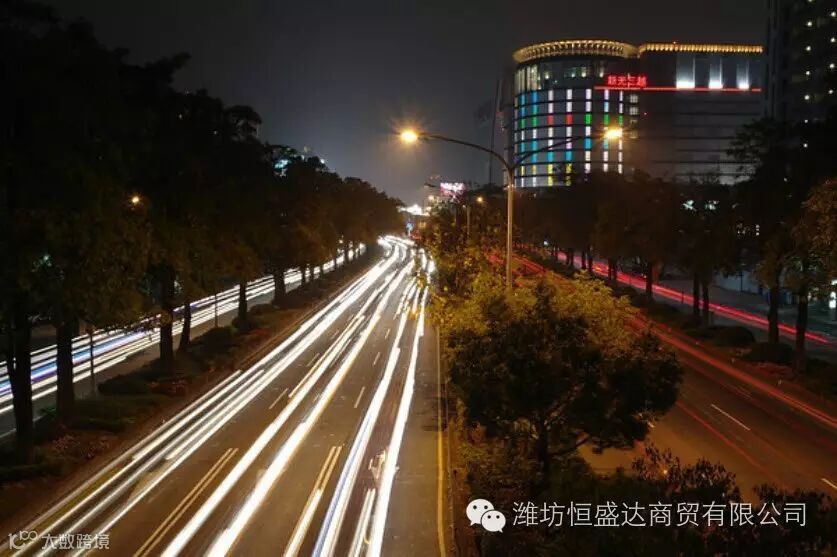 曝光时间长,记录下流动的车灯轨迹(ISO 100,F16,8s)