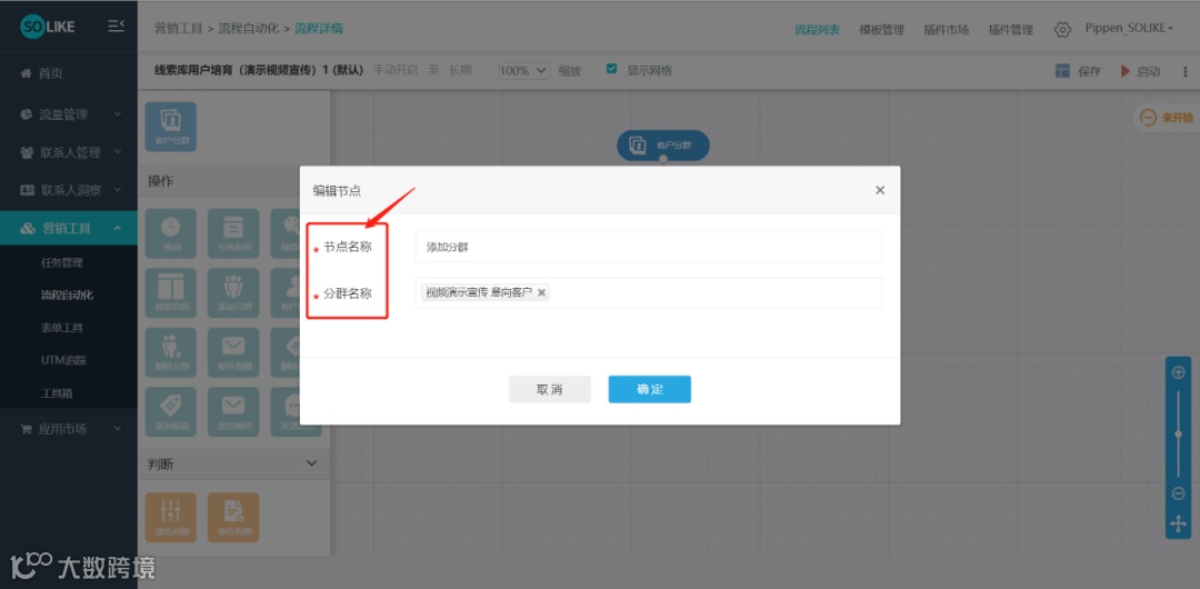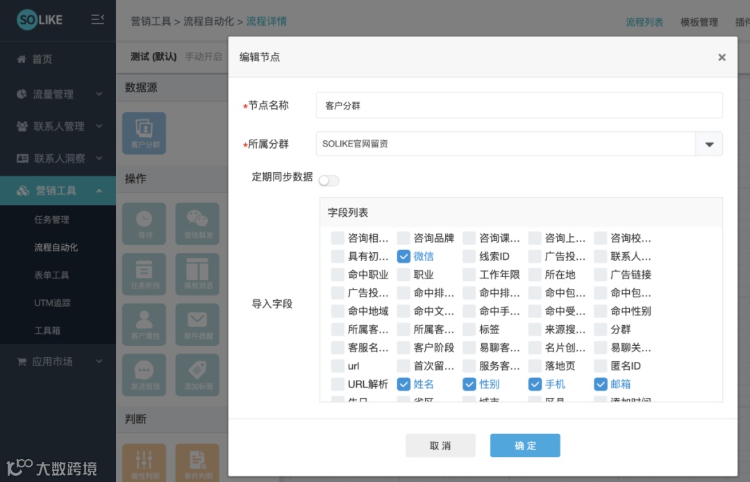 设置节点名称、所属分群、导入字段:节点名称-客户分群;所属分群-SOLIKE™官网留资;导入字段-微信、姓名、手机号、邮箱等 -