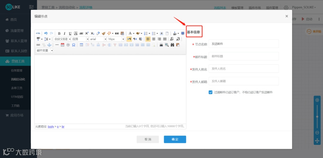 点击编辑填写基本信息(节点名称、邮件标题、发件人姓名、发件人邮箱)