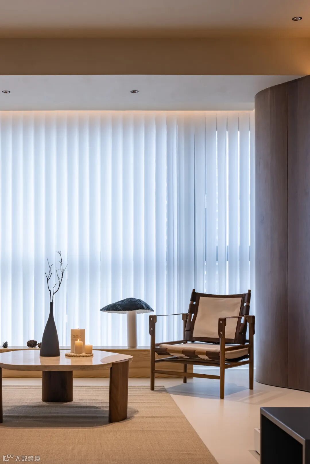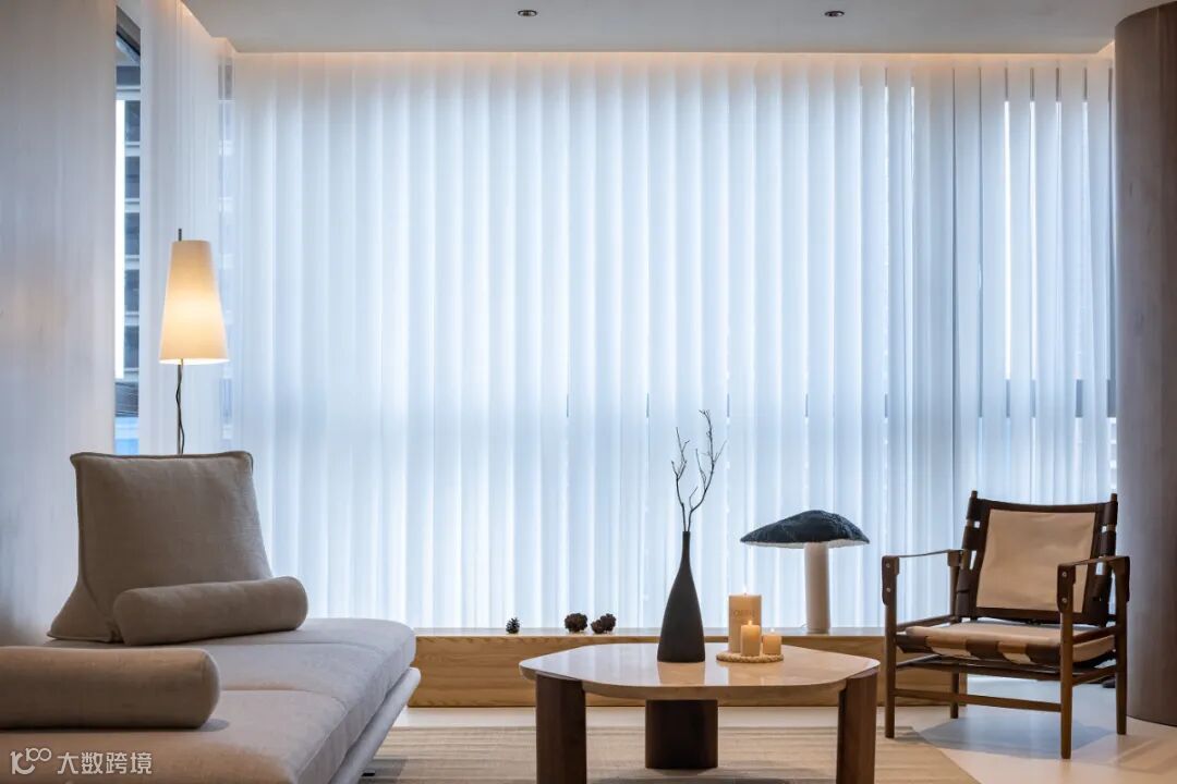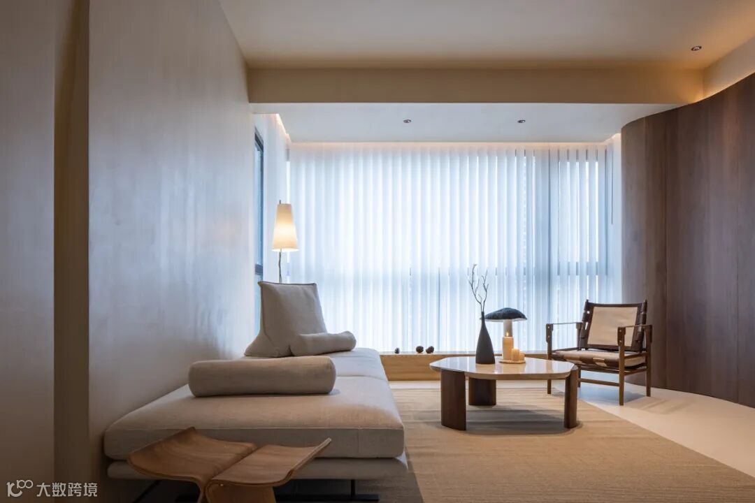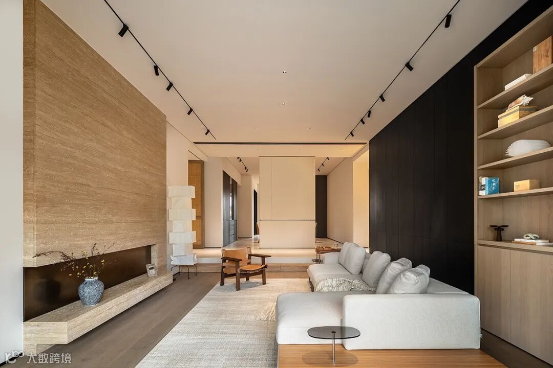 客厅的下沉式结构被原木踏步温柔衔接,形成自然而富有仪式感的过渡。木质的温润肌理与地面悄然对话,既划分了功能区域,又创造出视觉的微妙错落——空间因此拥有了呼吸的节奏。挑高的天花与低伏的家具形成巧妙对比,如同留白艺术的当代诠释。下沉的围合感非但不显逼仄,反而因尺度的精准把控,让视野向四周舒展延伸。这里仿佛一个被轻轻按下的休憩盆地,人在其中,既能感受包裹的安全感,又享有俯瞰全局的从容。