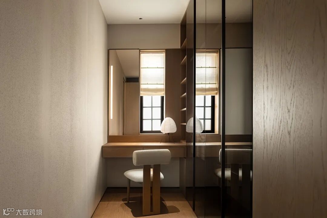 独立衣帽间采用透明柜门设计,既给狭窄的空间增加景深感,又方便主人快速挑选所需衣物。梳妆台借用窗户的自然光,透过纱布帘产生柔和的面光,为梳妆提供了理想的光感。