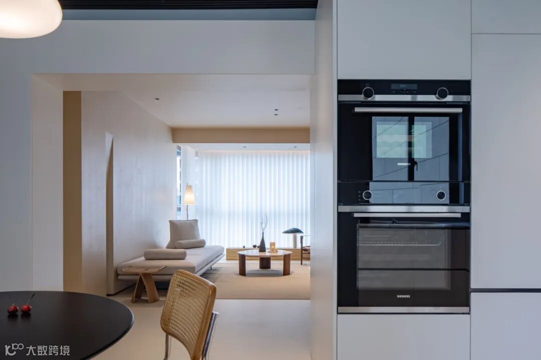 餐厅与厨房的边界被巧妙消解,科技感与时尚美学在此悄然对话。从客厅望去,错落的几何体块分割出纯白的悬浮展架与克莱因蓝的现代餐桌,如同一幅蒙德里安的构成主义画作。前景与远景的递进,在色彩与形态间形成微妙的视觉韵律——明黄与深蓝的碰撞,为素雅的空间注入一抹跳脱的活力。