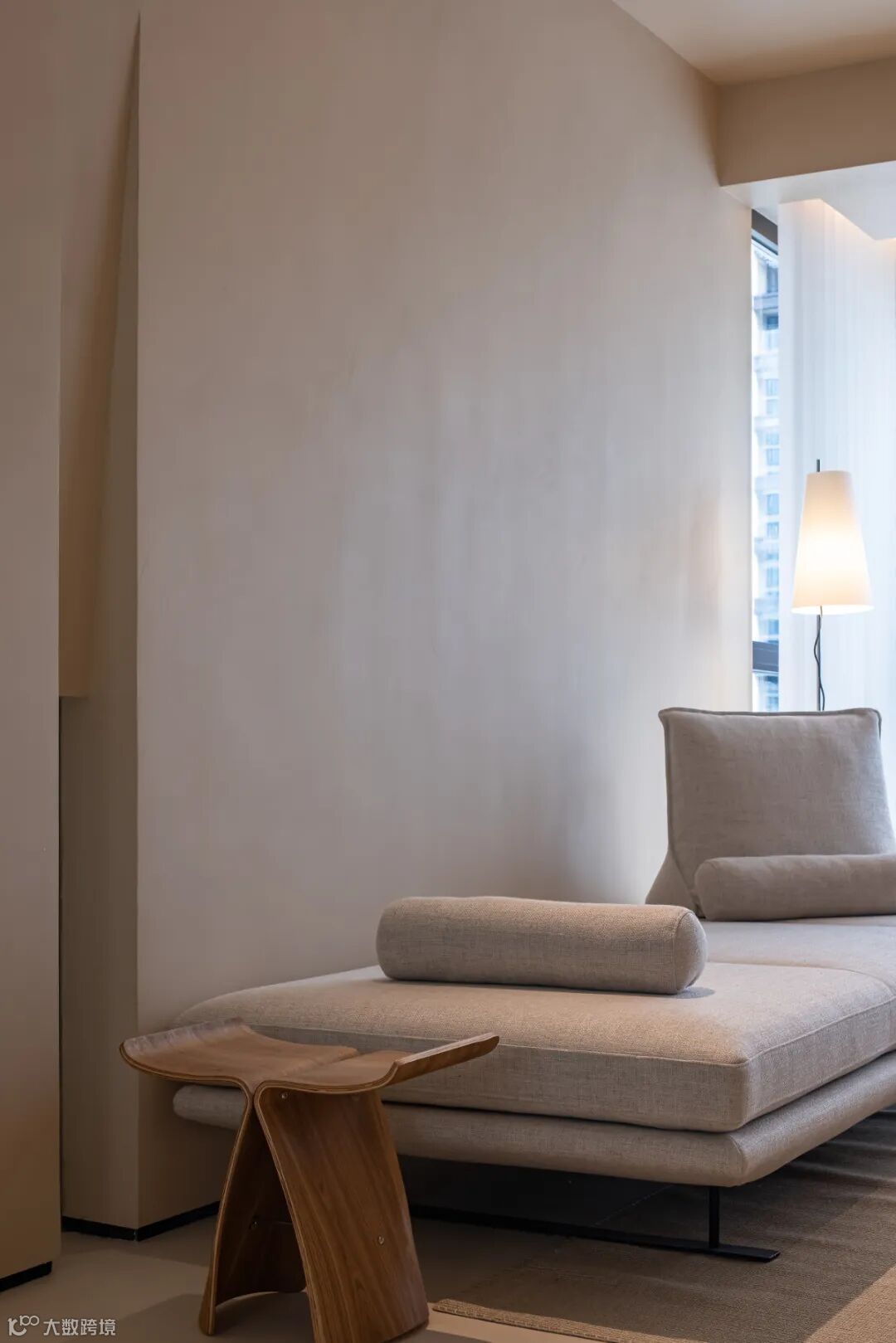 客厅的原建筑是下沉式设计,通过朴实的原木踏步与地面过渡相连,与其他空间产生了视觉上的落差,营造出丰富的层次感。因空间较为高挑,加上低矮的家具选择,在整个下沉式空间中,尺度被放大,视野更加开阔。