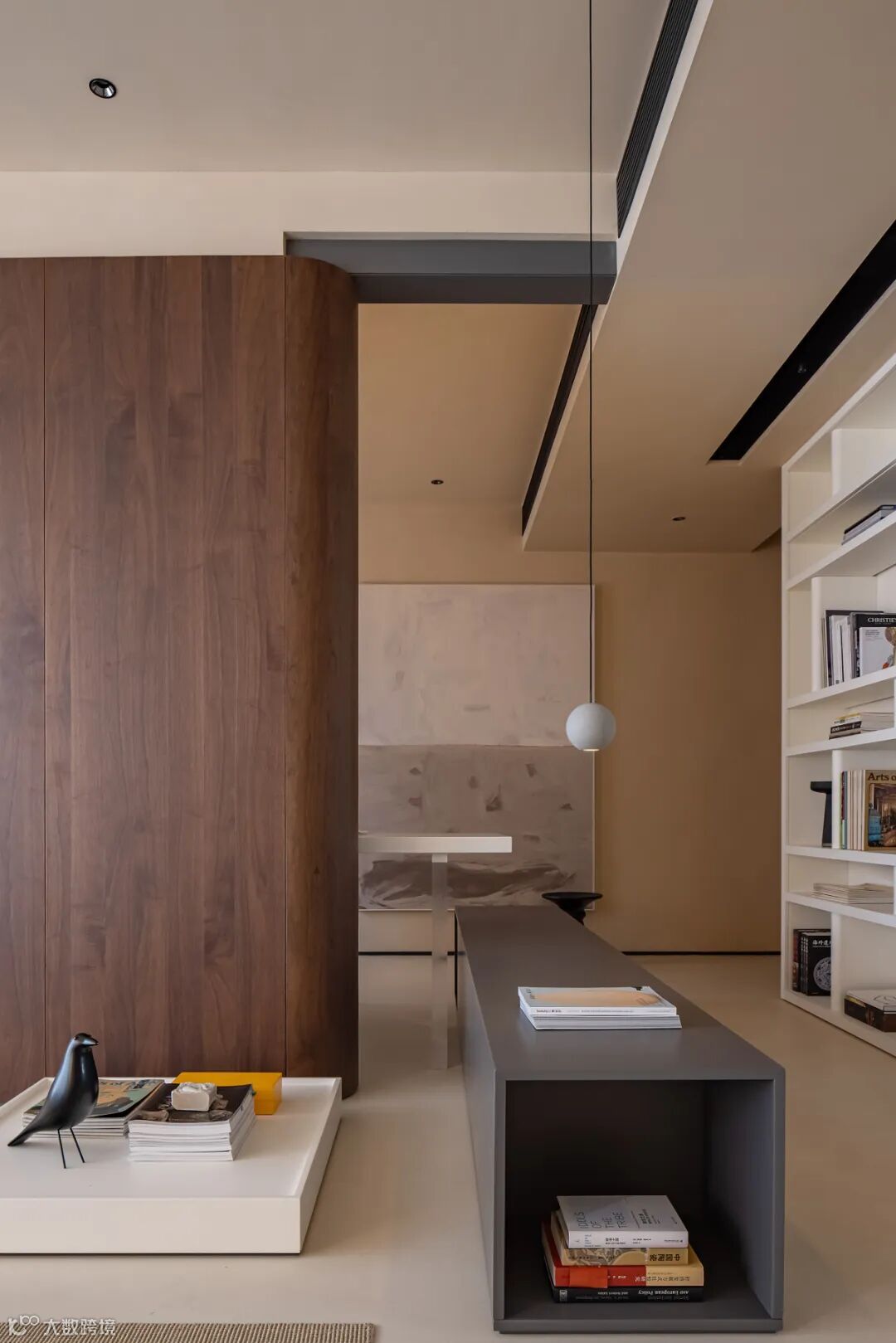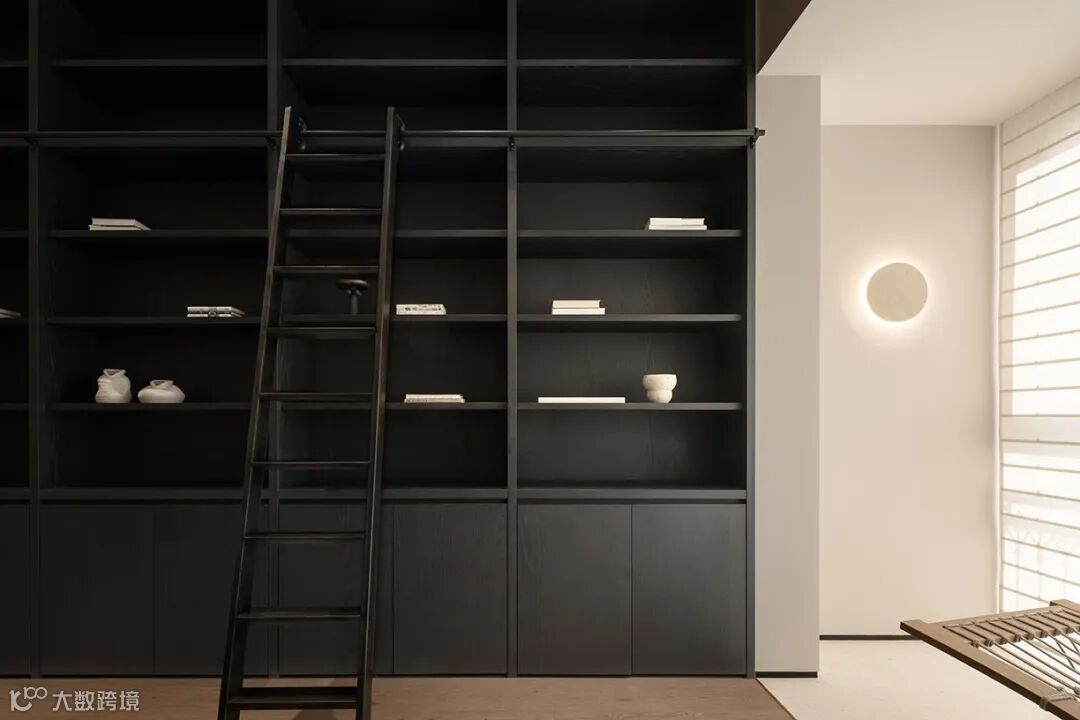 当布帘轻垂,阳光被筛滤成细腻的纱幔,在空间里织就一层朦胧的光晕。纯黑书柜如同深邃的夜空,将浮动的光线温柔吸纳,构筑出一方沉思的静域。墙灯亮起的刹那,恍若日冕蚀去最后一道金边——黑暗与光明在此达成微妙的平衡,思绪随之沉入无垠的想象渊薮。一株枫树静立,木墩如禅坐的蒲团,自然之物被赋予仪式感,在极简的构图中勾勒出侘寂之美。这不仅是阅读的场所,更是一场光的修行:物与影的对话,虚与实的交替,最终指向超越物质的精神谧境。当指尖掠过书页的沙响与树影的摇曳同频,便抵达了东方式栖居的最高意境——坐忘。