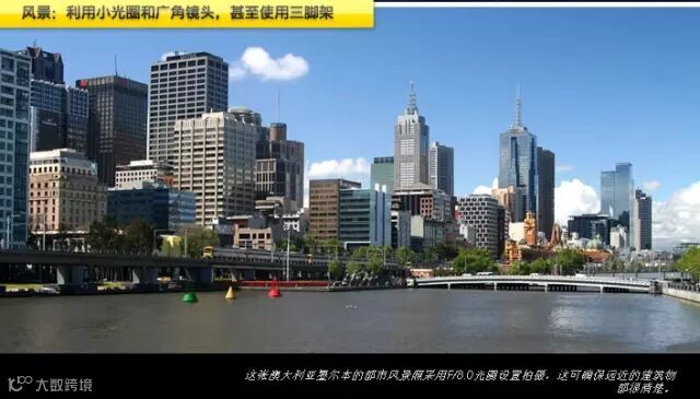 这张澳大利亚墨尔本的都市风景照采用F/8.0光圈设置拍摄,这可确保远近的建筑物都很清楚,一般风景照片中,您要让远近的所有元素都比较清楚,因此,您应该尽可能地设置小光圈(大F-stop值),您还可能要增大视角以便在最终照片中包括更多场景,因此一般来讲,选择具有短焦的广角镜头更好,最后要记得曝光平衡,如果您使用小光圈来增加景深,则必须降低快门速度进行补偿,因此,建议使用三脚架,以防止在慢速曝光期间因相机移动造成照片模糊。