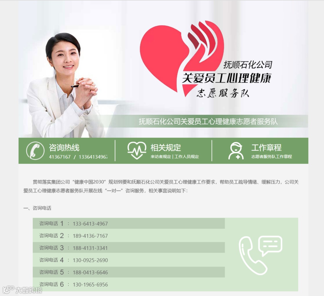 贯彻落实集团公司“健康中国2030”规划纲要和抚顺石化公司关爱员工心理健康工作要求,帮助员工疏导情绪、缓解压力,公司关爱员工心理健康志愿者服务队开展在线“一对一”咨询服务,相关事宜说明如下: