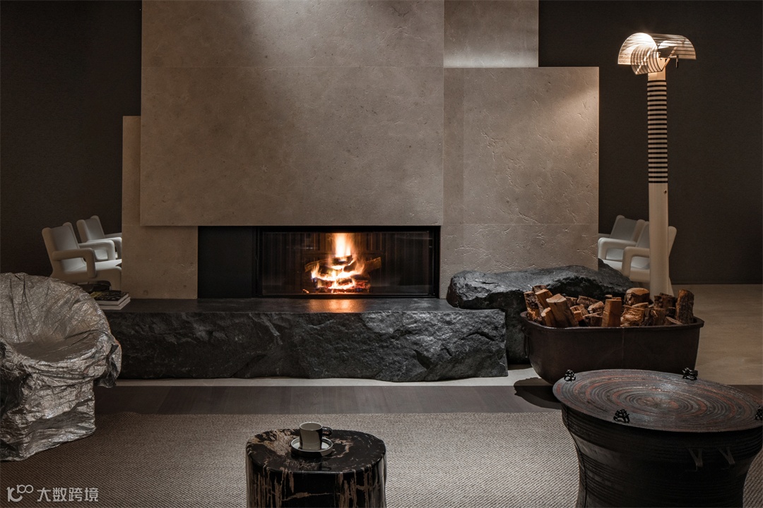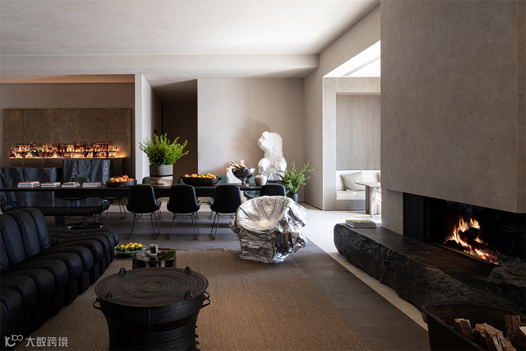 Tatzelwurm/DS600沙发出自家具世家de sede出品之手,摆放于会客厅核心位置。这件作品为起居空间注入了美感与生命力,将松弛感与商务感中和。一旁的Spartherm燃木壁炉与之呼应,以19世纪老挝大铜鼓,自然的绮丽、时光铸就的匠艺与家的温馨演绎。