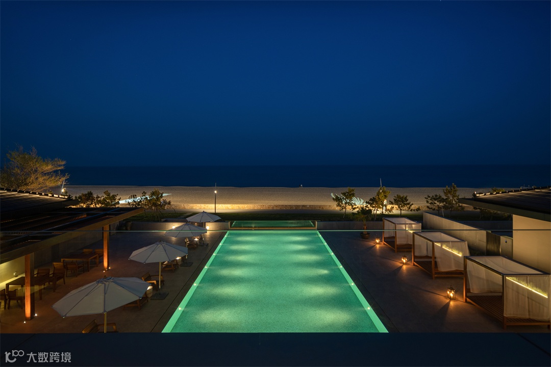 By the French window and looked at, orders, and may is geared to the needs of coastal sand sea swimming pool have a rest area. 17 meters infinity-edge pool as if combined with the sky; Poolside wooden dining table and guard the couch in the day, and the gauze curtain for travelers to enjoy the sunshine, beach, sea view, food and wine.