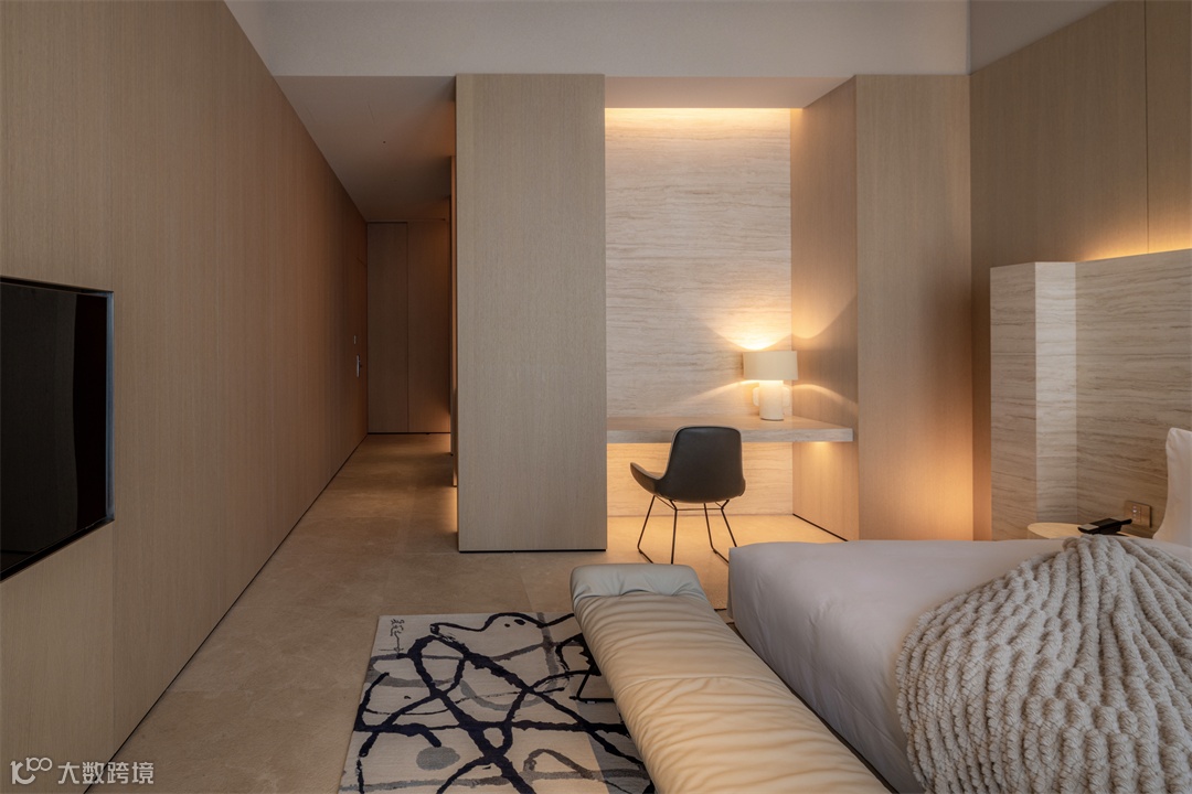 ● 零叁庭院大床房中,法国木纹石、橡木和柔美灯光系统相互作用下,产生的柔和温馨感。