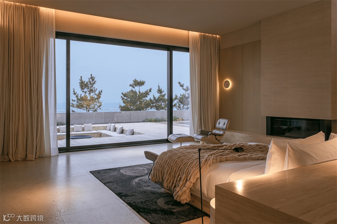 ● 位于底楼居中位置的零壹海景大床房,直面泳池平台和海滩美景的巨幅落地窗;睡床和超长法国白洞石书桌置于居室核心位置。