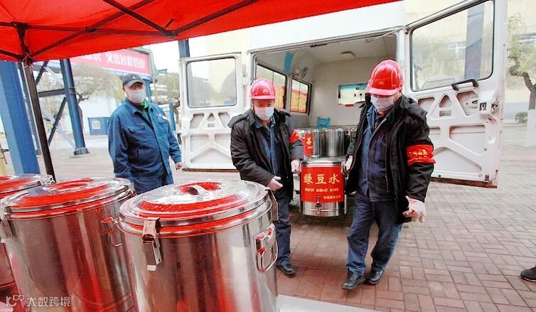 早晨7点30分,后勤服务公司文体服务部的街志刚副主任作为志愿者已经在石油三厂食堂服务两周了。他和同事将烧好的17桶饮品装进餐车,每桶水重60升,需要两个人才能抬得动。他们分别要送往分子筛装置、芳烃车间检修服务站、管网车间和中压加氢服务点。