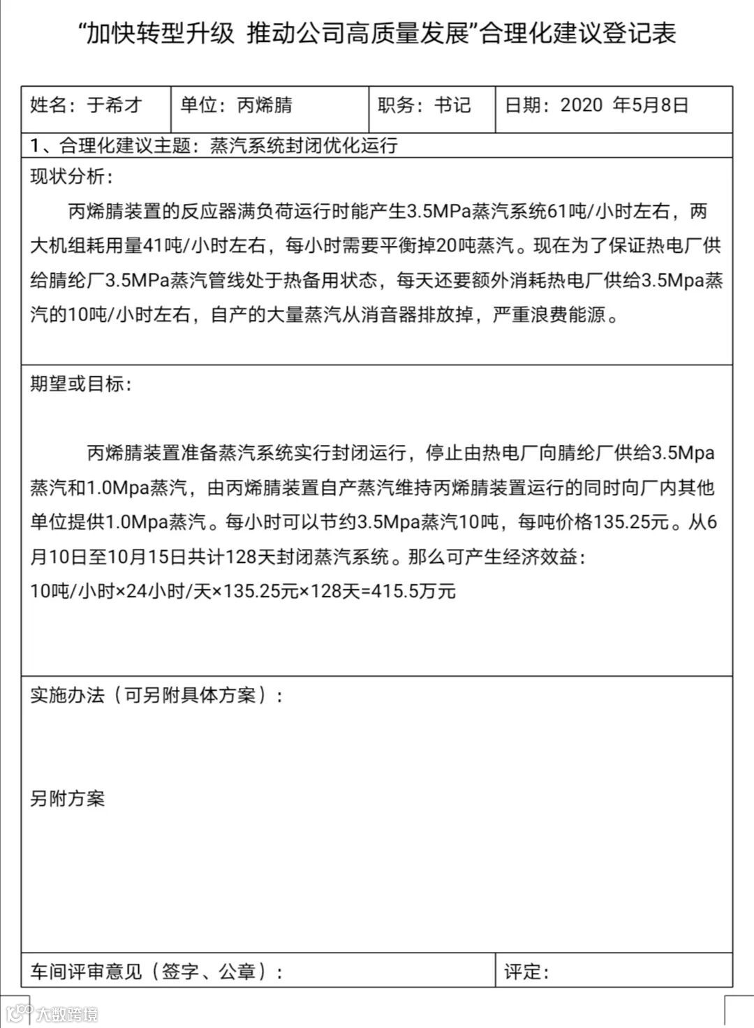 面对当下严峻的经济形势,腈纶厂丙烯腈车间老员工们提出的提质增效方案切合实际,提高了企业的经济效益。