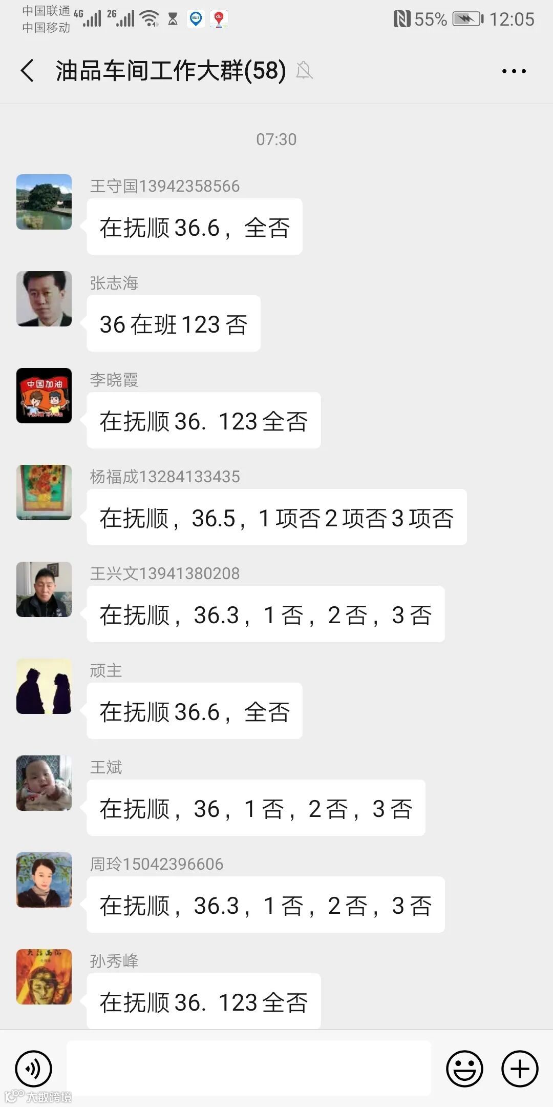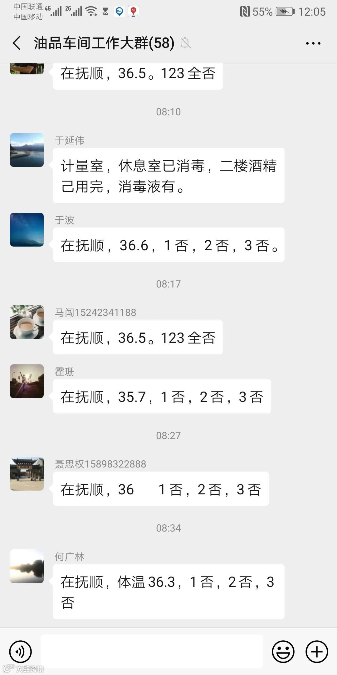 他在车间的工作群里连发三遍公告:“重要的事情说三遍,早上八点前,晚上最迟9点钟,务必准时上报体温!否则后果自负!”其他调度也均拿出严谨的态度,保证数据按时上报厂部。偶尔,有些师傅忙忘了,他们立即电话追踪过去或者在群里“@某某……赶快报体温行踪!”在他们的催促监督下,很快,油品人自觉性进一步提升,每天早上6点多开始,师傅们就开始主动报体温行踪,一个报,人人报,一天两次,秩序井然。