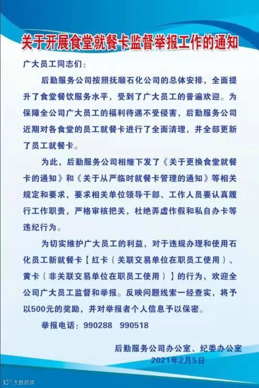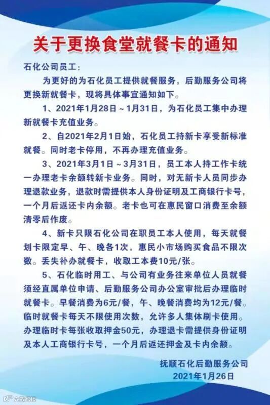 2月1日,为规范外来人员到食堂就餐办理临时就餐卡,后勤服务公司下发《关于从严临时就餐卡管理的通知》,加强对外来人员就餐管理,保障了公司员工利益,确保将公司改革发展成果不打折扣的惠及到全体员工。