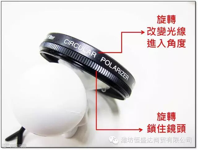 使用方式很简单,先用手指捏住具齿轮状的下圈,以便将环型偏光镜锁在镜头上,接着就是不断的旋转上圈,可以360度的旋转,以改变光线进入相机的角度,就可以达成消除物体反光、增加照片饱和度的效果。