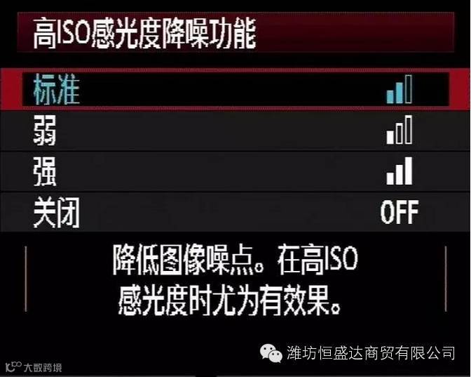 高 ISO 感光度降噪功能,就是允许你在采用高 ISO 值拍摄时,设定机内降噪处理性能,包括标准、弱、强和关闭4个选项。高 ISO 感光度降噪功能关闭时,画面上细节清晰,但是有明显的噪点和杂色。高 ISO 感光度降噪功能强时,噪点和杂色得到了有效的抑制,但是细节清晰度有所降低。因此,在拍摄照片时,要避免使用过强的降噪处理,使画面失去细节、降低锐度。通常情况下,设定为低或者标准即可。