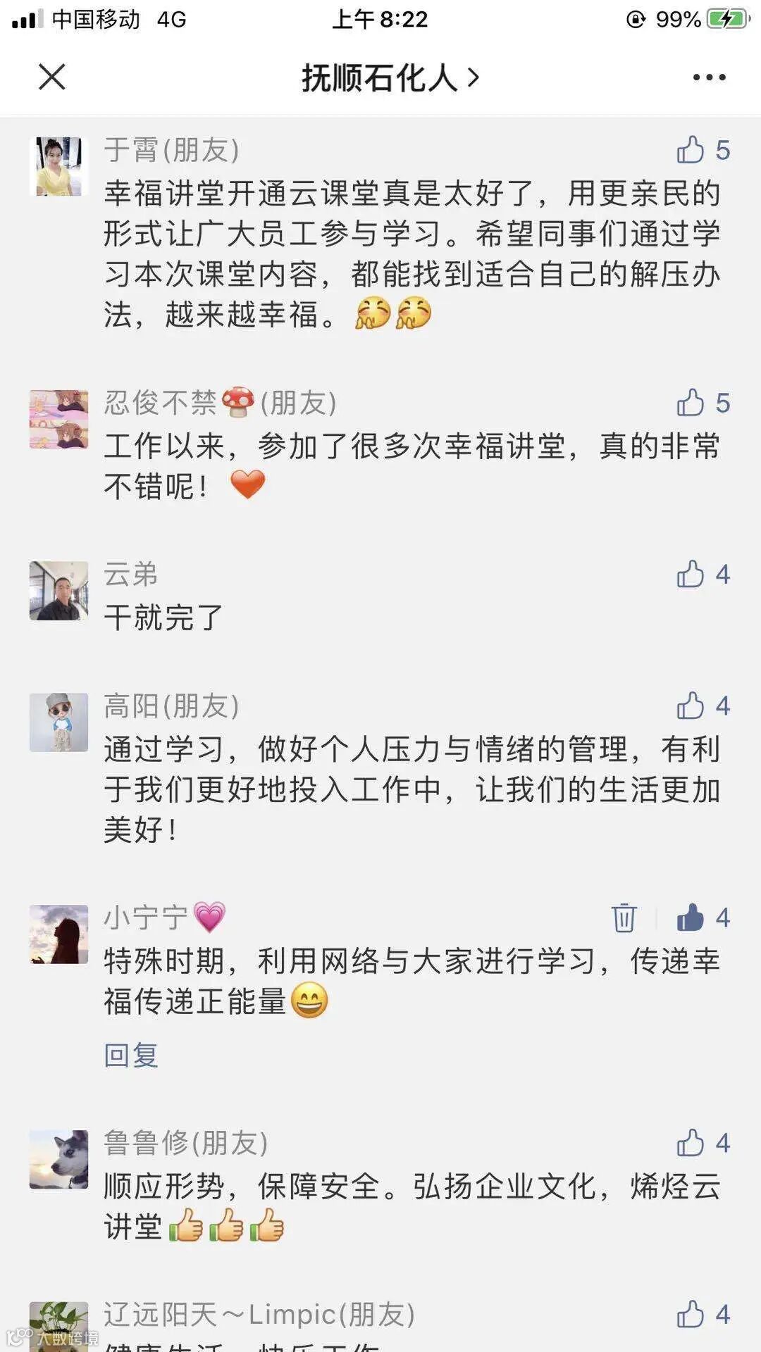 第一季“幸福云讲堂”《压力与情绪管理》的视频推出后,得到了全厂广大干部员工的支持与喜爱,视频单次播放量达到1000余次,留言互动量达到200余条。通过网络开展的培训讲座,为烯烃厂广大员工提供了“心齐、气顺、劲足”的心理放松平台,增强了员工的幸福感和归属感。