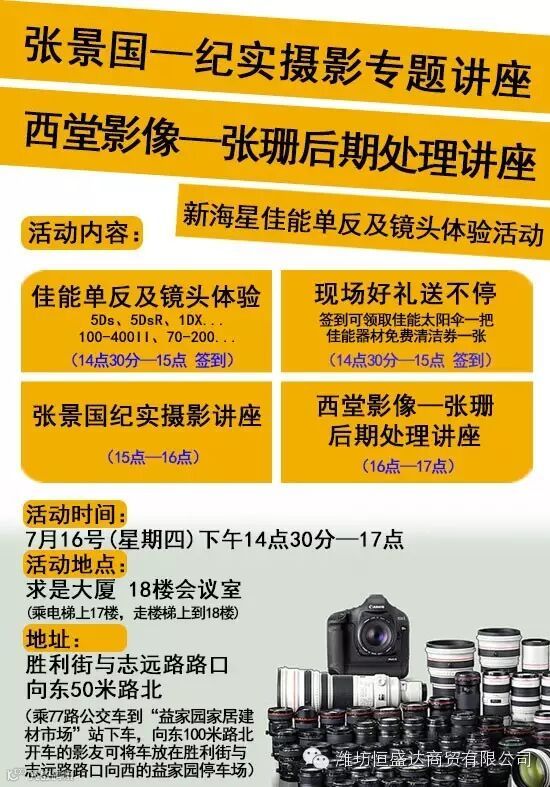 本次活动特邀张景国老师为大家讲解纪实摄影的技巧和作品赏析,更有西堂影像—张珊老师为大家带来专业后期处理的讲座。现场签到即可获赠佳能太阳伞一把,佳能器材清洁券一张。机会难得,欢迎您的参加。免费活动哦~!