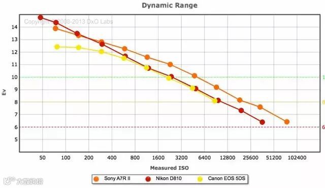 索尼A7RII总分98,超过尼康D810(97)成为DxOMark的新冠军。A7RII的优势在于色彩深度和高感。动态范围方面,D810在ISO 64-200方面略有优势,A7RII则在ISO 400之后反超D810(缩图后的比较)。