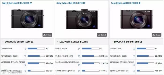 索尼RX100IV总分70,高于前两代产品,色深、动态范围、高感都有小幅提升。