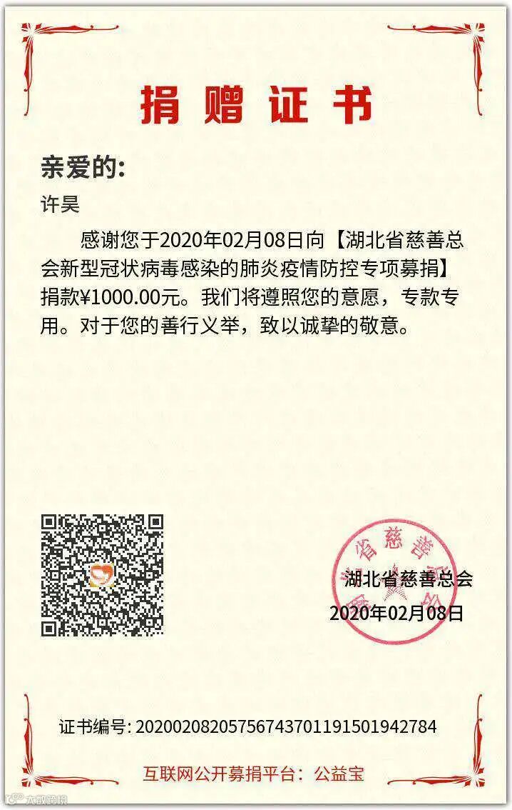 疫情发生以来,许昊一家一直都在关注武汉的情况,被医护者、志愿者们的行动感动着。2月8日元宵节,许昊一家人围坐在电视机前看电视,当得知武汉急需医疗物资时,许昊在知道妻子已捐助1000元的情况下,当即又向湖北省慈善总会捐助了1000元。