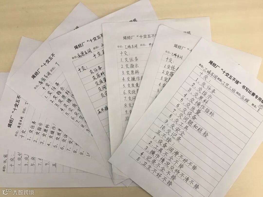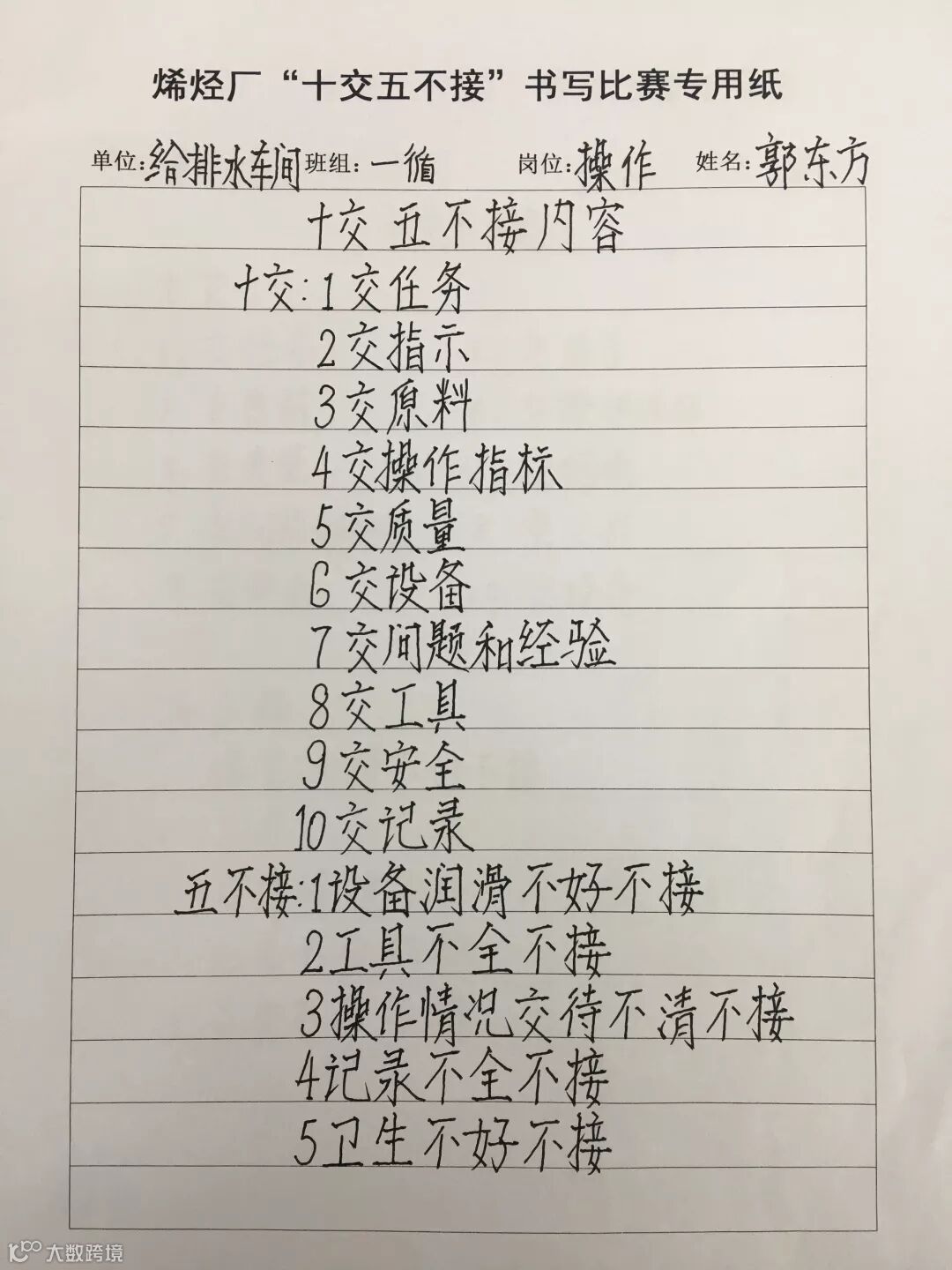 为贯彻落实安全生产工作要求,牢固树立“没有安全就没有效益”的思想理念,规范交接班日志的管理,真正做到交接清楚明了,明确各班组之间的交接责任,加强交接班记录的书写,烯烃厂结合“安全生产月”和生产实际,组织开展了“十交五不接”交接班日志仿宋体书写作品征集活动。