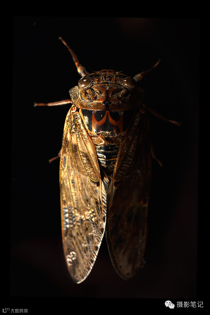 上图是一只我在地上捡到的处于生命末期的蝉,利用手机屏幕做背景,将双灯头闪光灯的光比设置为1:4所摄。