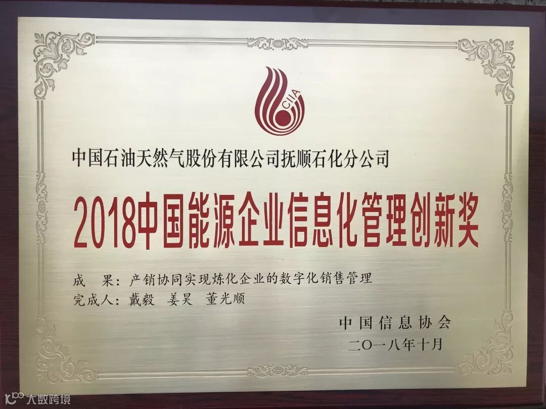 10月19日,在第八届中国能源企业信息化大会上,抚顺石化公司“产销协同实现炼化企业的数字化销售管理”获中国能源企业信息化管理创新奖。这是公司今年以来继获全国石油石化企业信息化优秀示范单位后,再次取得的信息化建设方面的荣誉。