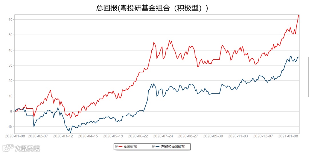 粤投研积极型基金组合累计上涨62.9%,同期沪深300指数上涨35.44%,跑赢沪深300指数27.46%。2020年1月9日-2021年1月22日,数据来源:Wind。
