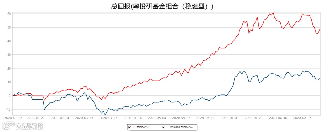 粤投研稳健型基金组合累计上涨48.51%,同期沪深300指数上涨12.52%。2020年1月9日-2020年9月11日,数据来源:Wind。