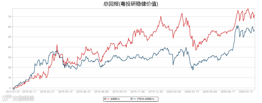粤投研稳健价值模拟组合累计上涨71.70%,同期沪深300指数上涨56.74%。2019年1月1日-2020年8月21日,数据来源:Wind。