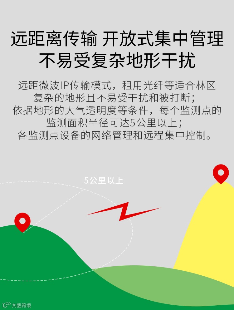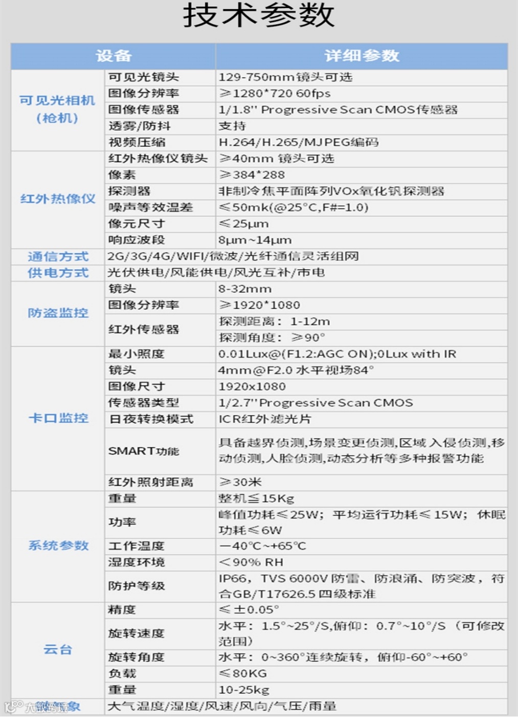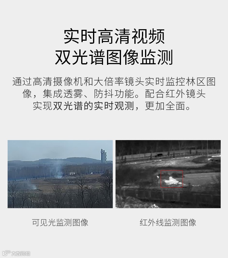 系统采用野外重型载重云台(载重30-40KG),云台负载能力强,抗风、抗震能力强,耐高温抗冰雪。云台采用大传动设计,金属结构,铜齿轮盘、力矩大稳定性高,超低速运行。同时配备大型全天候防护罩,装备高清晰远距离电动长焦距透雾镜头和超低照度百万高清晰摄像机,设计红外热成像系统利用热成像原理,通过接收物体发射的红外线,将被测目标物体表面的红外辐射转变成视频信号. 它接收被探测目标自身辐射的热能,即中、长波红外能量,并将其转换成反映目标特征的实时物体表面的热图像,来监测火灾及其他异常事件。并结合现今行业发展水平的集成化,网络化的红外热成像森林防火图像监控系统的解决方案。
