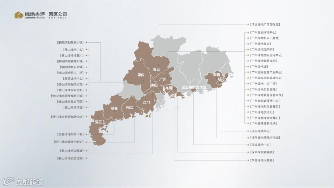 绿地香港湾区公司,汇聚绿地粤港澳大湾区业务资源,集中力量深度参与大湾区建设,推动粤港澳大湾区房地产业务更好更快发展。公司充分发挥丰富的规划建设经验、超强的资源整合能力和卓越的产业运营水平,先后打造了40余个高品质住宅、大型城市综合体及产业项目,遍及广州、佛山、东莞、深圳、肇庆、江门、清远、揭阳、汕头、阳江、茂名、湛江、深汕合作区等13个城市及区域,广泛布局粤港澳大湾区城市群。