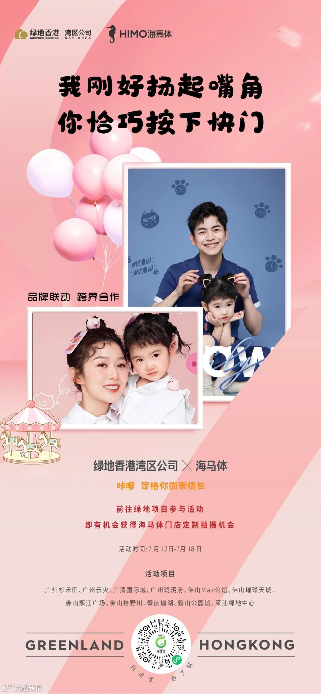 即日起,绿地香港湾区公司将诚意邀请客户前往同城项目主题打卡点前拍摄“创意表情包”,拍摄完成后即有机会获得绿地香港湾区公司与海马体联名推出的价值300元/张的拍摄礼品卡,该卡可用于海马体门店拍摄抵扣使用,如证件照、个人写真、全家福等,有效期为三年。(礼品卡数量有限,先到先得)