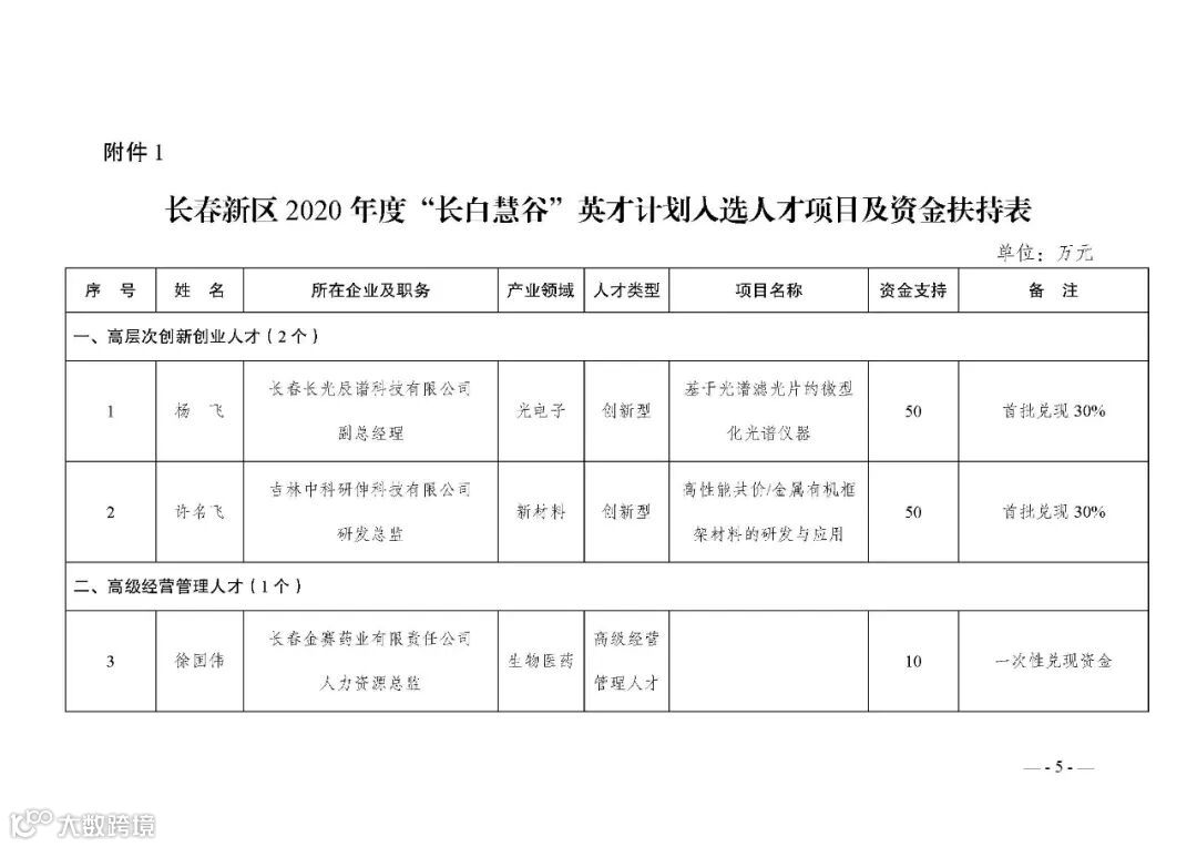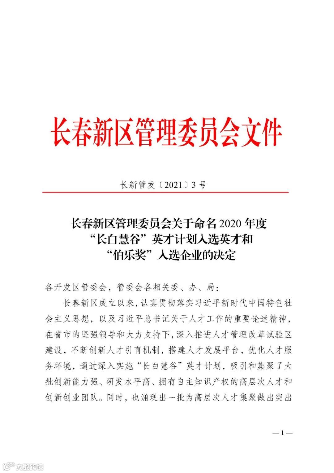 近日,长春新区管理委员会公示了《长春新区管理委员会关于命名2020年度“长白慧谷”英才计划入选英才和“伯乐奖”入选企业的决定》。