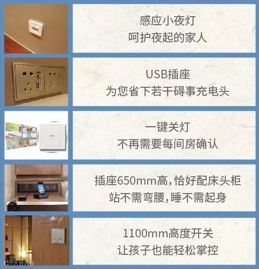 而感应小夜灯、USB插座、一键关灯、1100mm高度小孩开关等人性化开关设计,生活一键掌控。