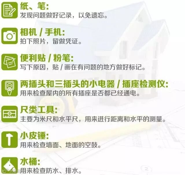 在验收中发现的问题,要及时地记录下来,反映给开发商。验收前,还要准备好一些工具,方便进行验收工作。