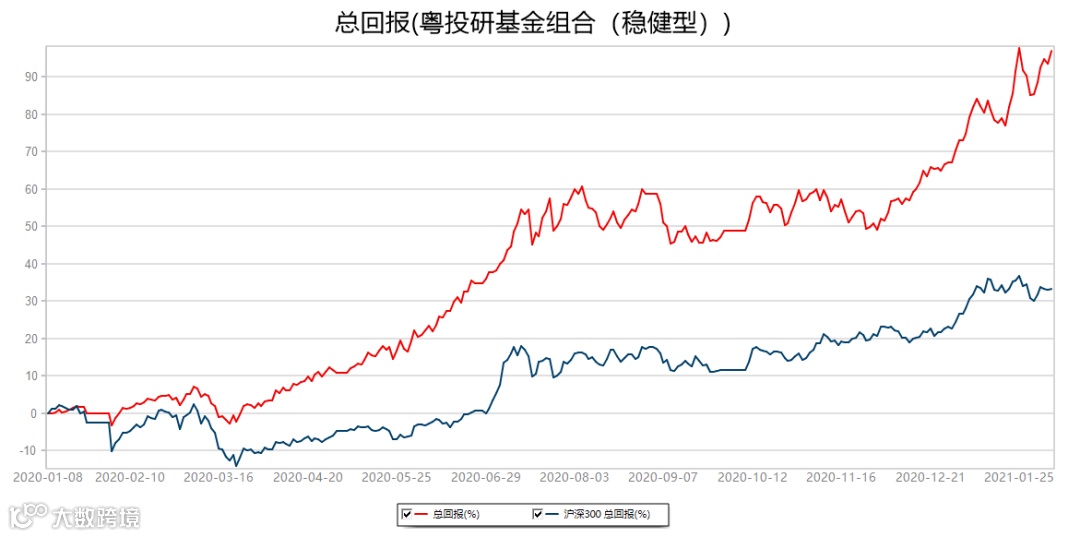 粤投研稳健型基金组合累计上涨97.12%,同期沪深300指数上涨33.34%,跑赢沪深300指数55.39%。2020年1月9日-2021年2月5日,数据来源:Wind。