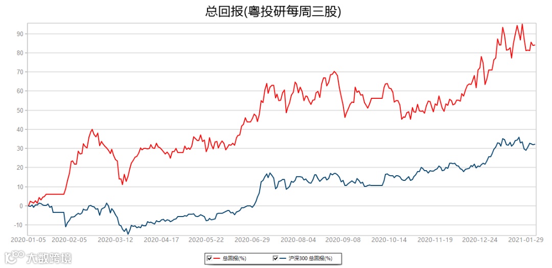 粤投研每周三股模拟组合累计上涨84.07%,同期沪深300指数上涨32.29%,跑赢沪深300指数51.78%。模拟组合计算方法:每周首个交易日开盘买入,最后一个交易日收盘卖出。2020年1月5日-2021年2月5日,数据来源:Wind。订阅粤投研每周三股,请联系光大证券营业部工作人员。