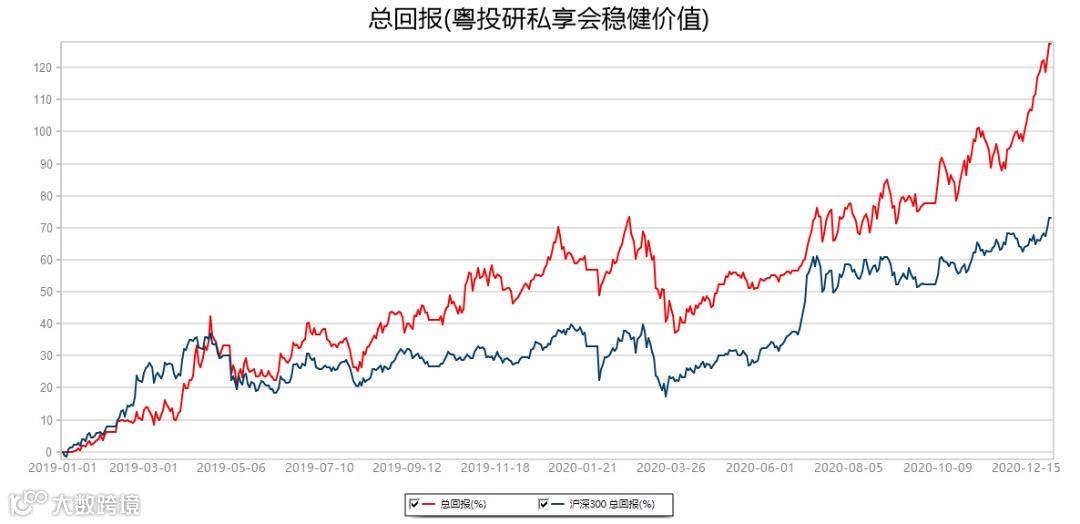粤投研私享会-稳健价值模拟组合累计上涨127.45%,同期沪深300指数上涨73.1%。2019年1月1日-2020年12月31日,数据来源:Wind。