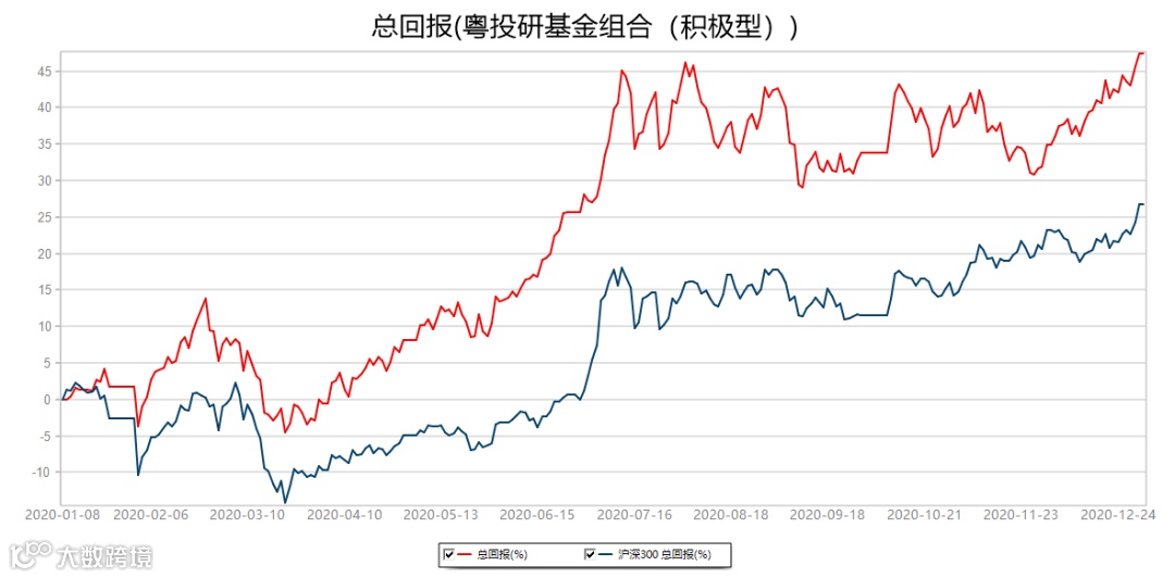 粤投研积极型基金组合累计上涨47.39%,同期沪深300指数上涨26.72%。2020年1月9日-2020年12月31日,数据来源:Wind。
