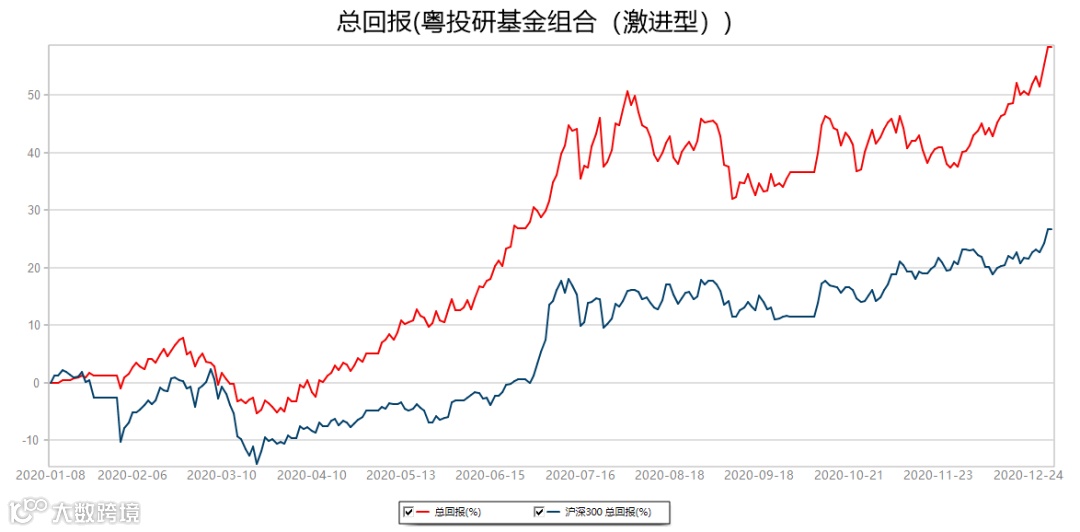 粤投研激进型基金组合累计上涨58.39%,同期沪深300指数上涨26.72%。2020年1月9日-2020年12月31日,数据来源:Wind。