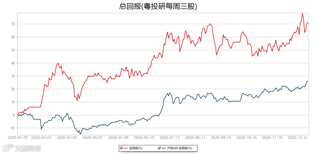 粤投研每周三股模拟组合累计上涨70.91%,同期沪深300指数上涨25.73%。模拟组合计算方法:每周首个交易日开盘买入,最后一个交易日收盘卖出。2020年1月5日-2020年12月31日,数据来源:Wind。订阅粤投研每周三股,请联系光大证券营业部工作人员。