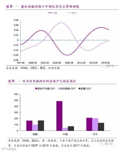 我们在思考逆周期政策应对的时候,还要关注金融周期下行期调整这个大环境,在高杠杆的情况下,链条崩的很紧,信用有自发紧缩的动能(图8)。同时,房地产已处在高位,像过去依靠房地产抵押品的角色再来一次大的信用扩张,不太可能。图9比较了中美日三大类资产市值对GDP的比例,中国房地产市值对GDP比例非常高,坚持房住不炒,降低房地产的金融属性是政策的大方向。