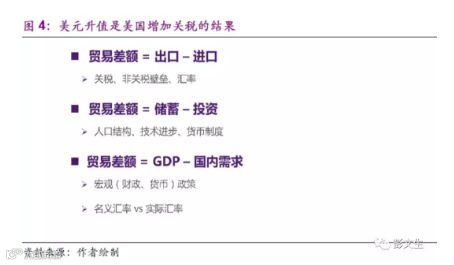 从宏观经济平衡来讲,贸易顺差还是逆差取决于储蓄率和投资率之差,而这从中期来讲取决于人口、技术进步等结构性变量,加征关税改变不了这些更基本面因素。从进口和出口这个角度来看,关税增加打破了过去的平衡,这其中必须有一个变量来抵消关税对进口价格的影响,这便是汇率(图4)。