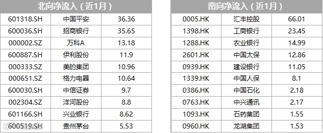 国庆后市场整体出现下跌后震荡反弹的行情,我们也在统计了最近一个月陆股通(北上)和港股通(南下)的资金流向数据(来源:WIND,单位:亿元)。