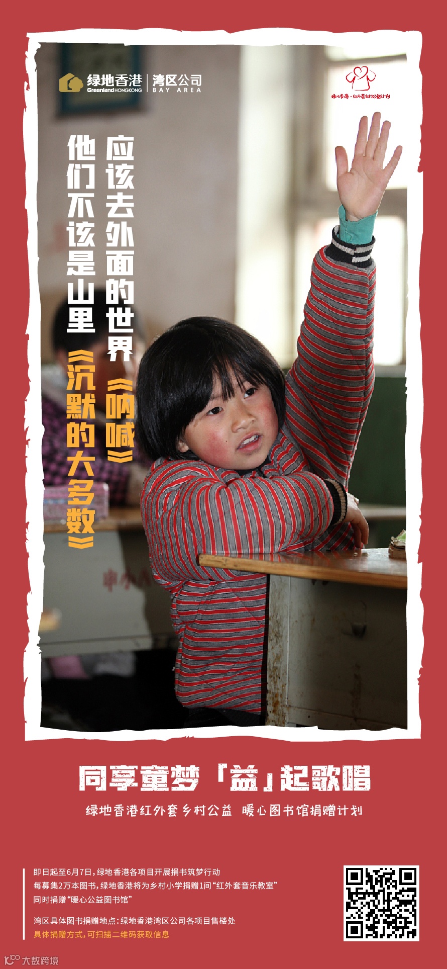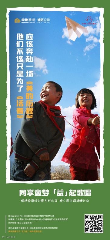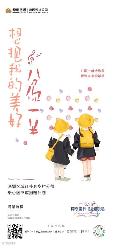 与城市共生长,与社会共美好,2021年,绿地香港湾区公司积极落实绿地香港红外套乡村公益计划,在六一儿童节之际,号召社会爱心人士积极参与到捐书筑梦行动中,一起守护山区孩子们的梦。每募集2万本图书,绿地香港将为乡村学校捐建1间暖心公益图书馆及1间音乐教室,为孩子们插上梦想的翅膀,让他们飞向更高的“天空”。