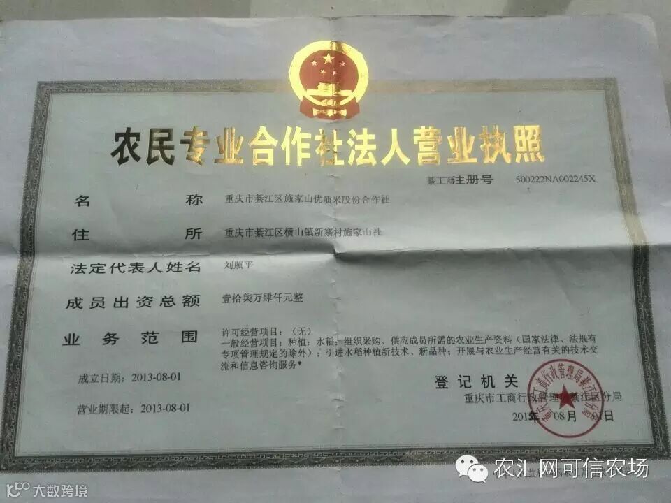 单位名称:重庆市綦江区施家山优质米股份合作社