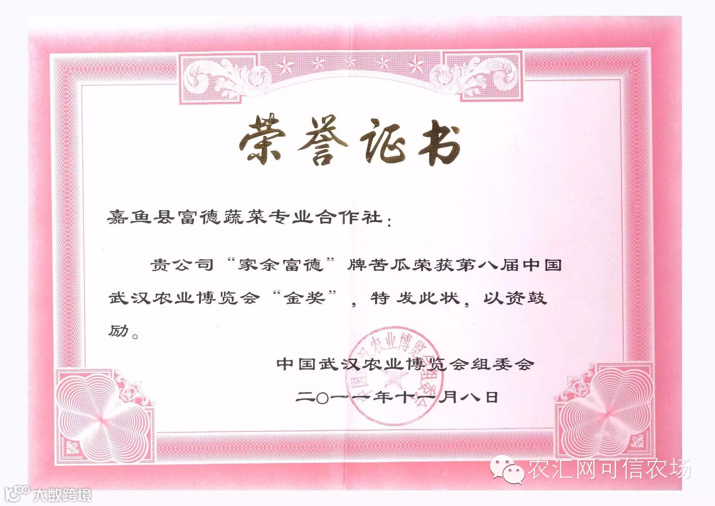 本合作社注册有“家余富德”商标,2011年参加第八届中国武汉农业博览会,“家余富德”苦瓜被评为金奖农产品;2012年“家余富德” 9个蔬菜品种(大白菜、甘蓝、西兰花、辣椒、茄子、番茄、苦瓜、黄瓜、节瓜)经中国绿色发展中心认定为绿色食品,许可使用绿色食品标志(企业信息码:GF421221122053);2012年经湖北出入境检验检疫局审查获得出口蔬菜种植基地备案(基地备案编号:420115SC00003);连续四年被咸宁市政府授予“十佳专业合作社”,“家余富德”商标为咸宁市知名商标,市工商局授予“守信用、重合同企业” ,市农业产业化授予“市级龙头企业”。