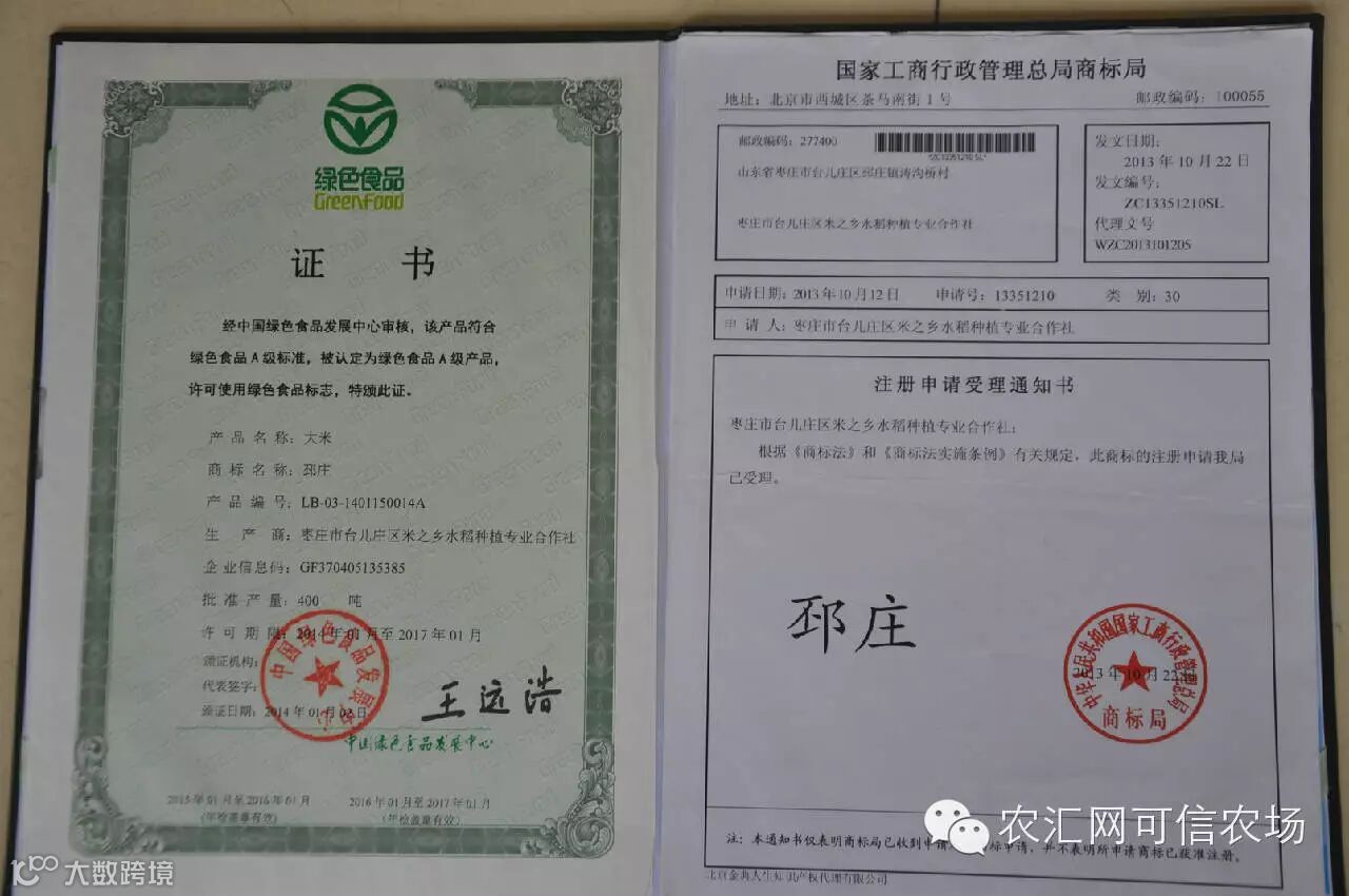 2014年1月,合作社生产的“邳庄牌”大米荣获国家地理标志商标,被国家农业部绿色食品发展中心认定为绿色食品A级产品。下一步,合作社将充分发挥“邳庄牌”大米的品牌带动作用,进一步扩大扩大无公害绿色有机稻米播种面积,带动更多农户发家致富